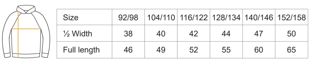 | Kindergrößen | 104 / 110, 116 / 122, 128 / 134, 140 / 146, 152 / 158, 92 / 98 |